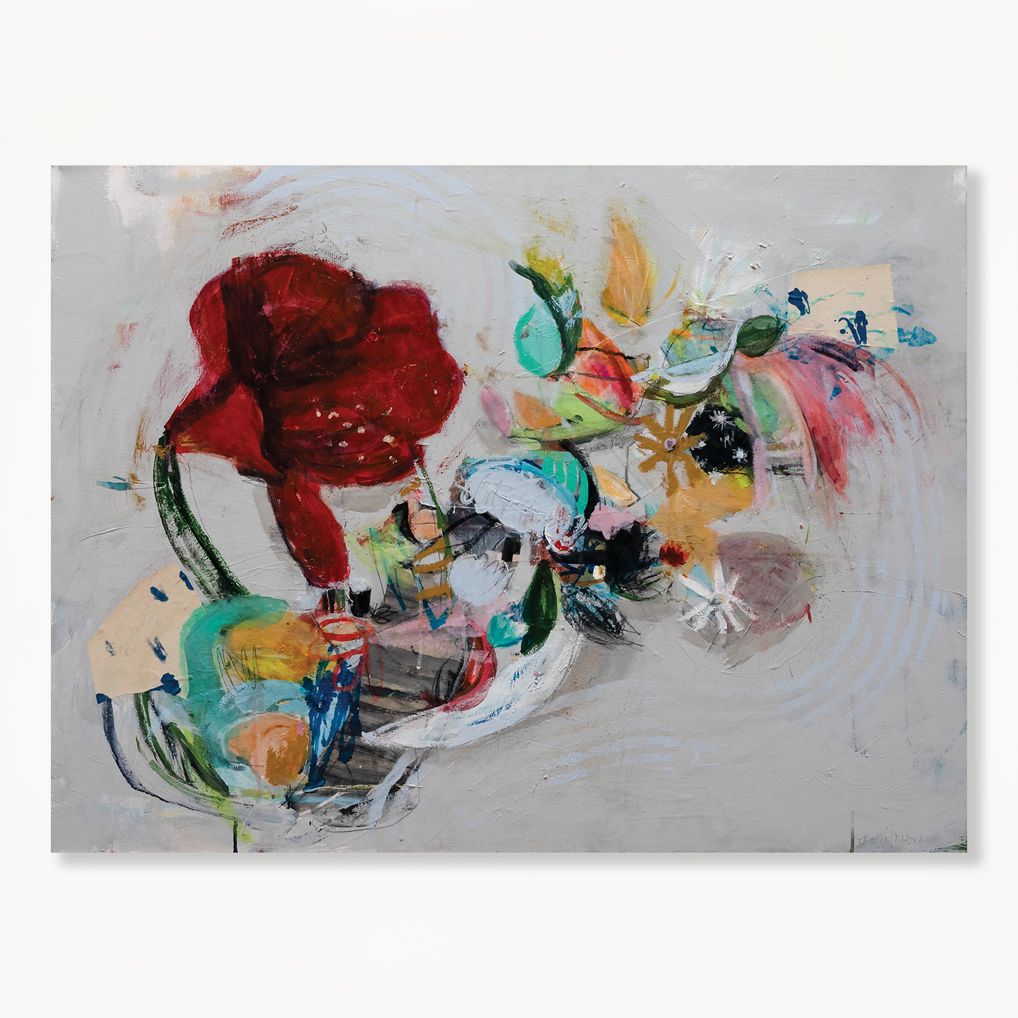 Amaryllis by Trisha Gilmore is an acrylic, mixed-media painting on canvas that appears airy yet grounded, with a soft gray field that lets the colors breathe. A bold, velvety red bloom anchors the left side, counterbalanced by a loose cluster of lighter, more playful floral forms to the right. Energetic marks, scraped lines, and layered color patches create a sense of motion and improvisation, while translucent whites and muted neutrals soften the intensity. The overall mood is quietly joyful, expressive but restrained, like a fleeting still life caught mid-gesture.